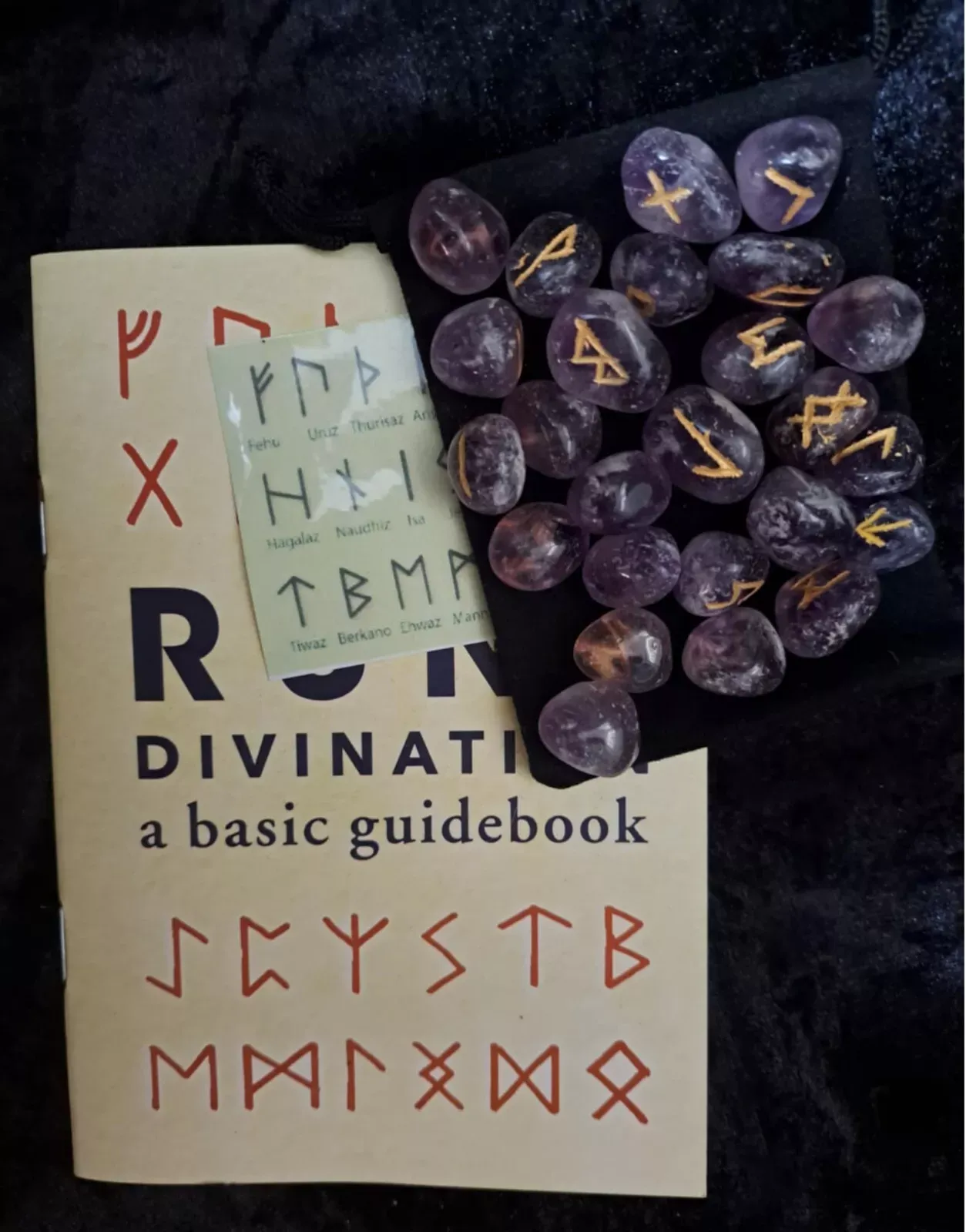 Amethyst Rune Set - Runes, Book, Chart & Pouch. These runes are on the smaller size.