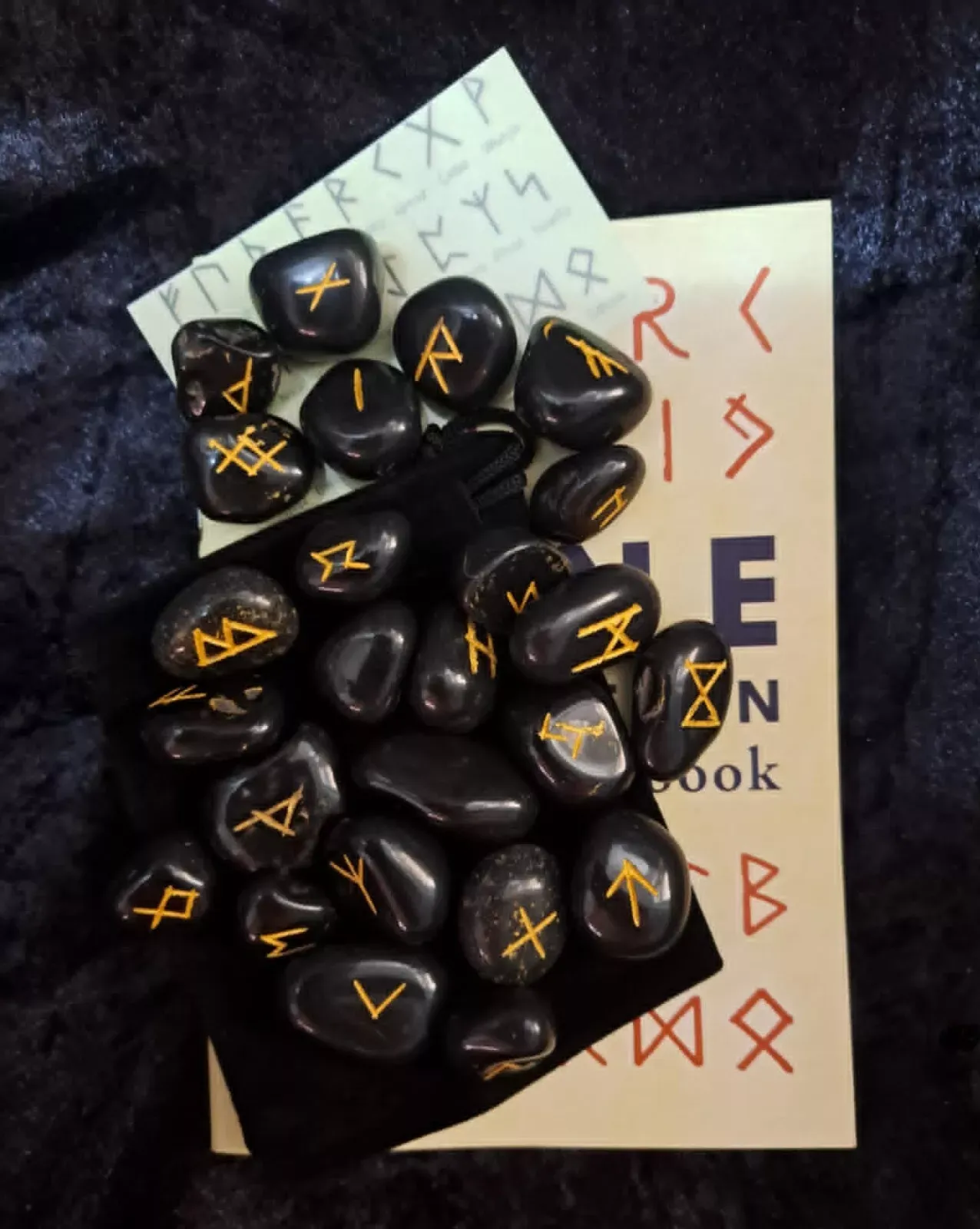 This set comprises of 25 Futhark Black Obsidian Runes, Book, Chart and Velvet Drawstring Pouch.