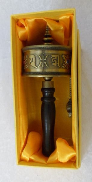 Inside this Prayer Wheel you will find a scroll with Om Mani Padme Hum written upon it. By spinning the wheel it is said that it is sending the mantra sky-wards, wishing compassion for all sentient beings; and spreading 1000's of spiritual blessings.