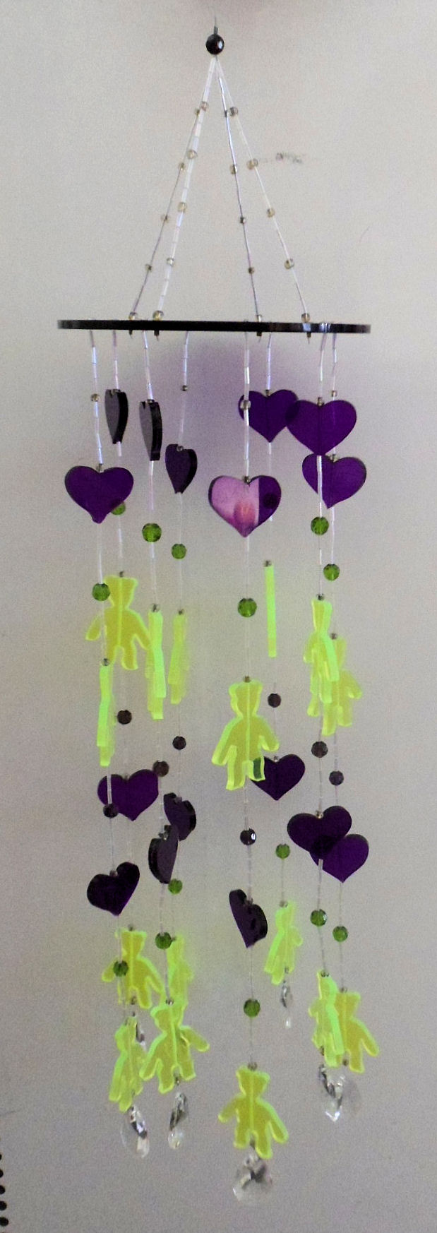 Green Teddy Bear, Purple Heart and Crystal Drops Mobile.